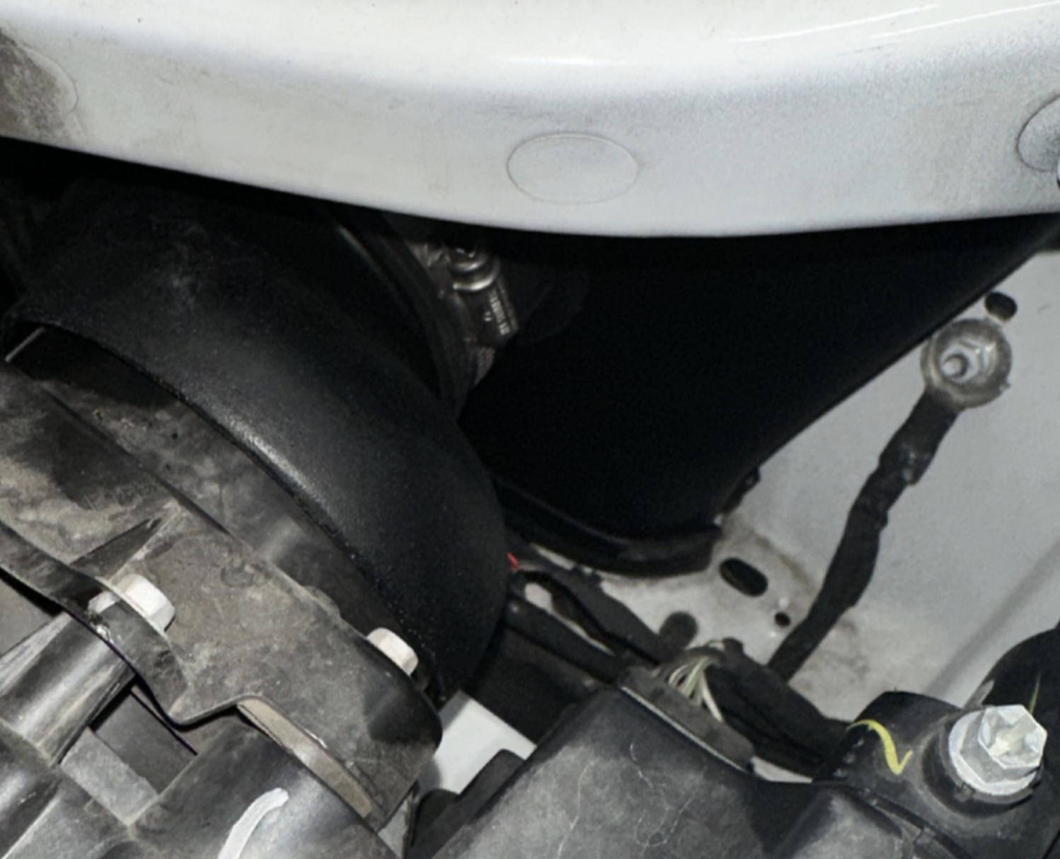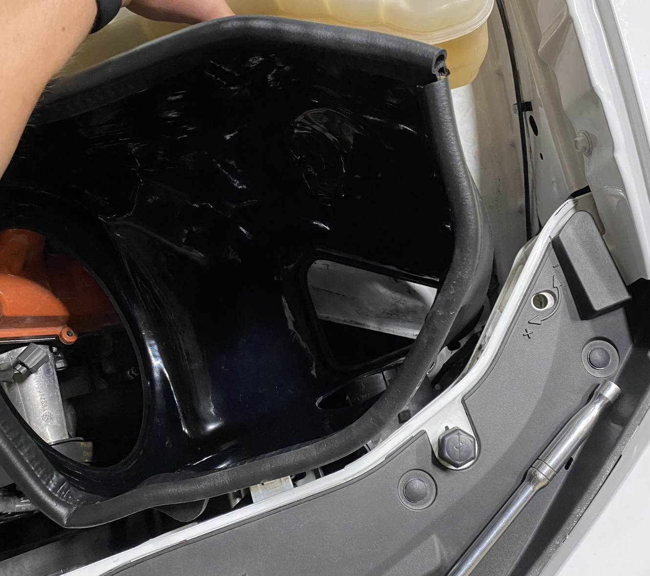 Put the JLT box into the vehicle, guiding the box to line up with the headlight inlet scoop location. You can pull the coolant tank away to give you more room to position the box.