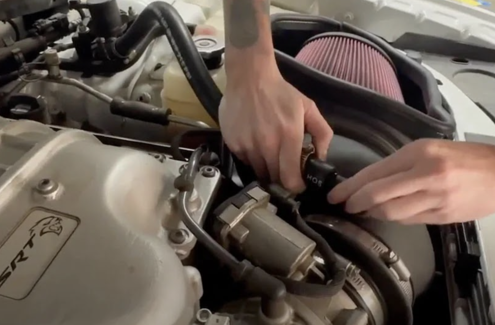Install the 5/8" PCV Hose onto the open barb on the vehicle, making sure the hose is the correct length to the barb on the tube (cut if necessary). Put both small hose clamps onto the hose, afterwards connecting the 90 degree barb fitting to the other end of the hose. Fully tighten the hose clamps.