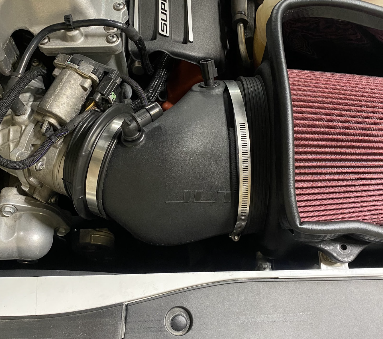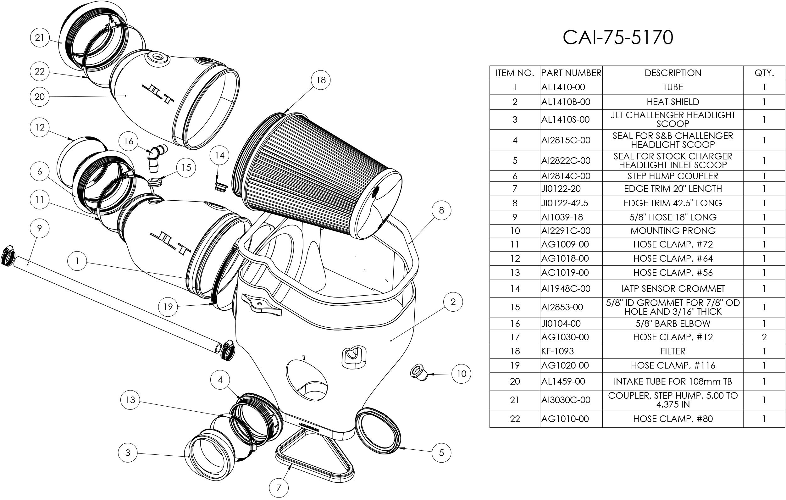 For stock throttle bodies, use the intake tube (AL1410-00) that is longer and has the smaller throttle body connection diameter. For 108mm throttle bodies, use the shorter tube (AL1459-00) with the larger diameter. Install the 5/8“ ID Grommet into the tube, and then the 5/8" barbed elbow into the grommet.