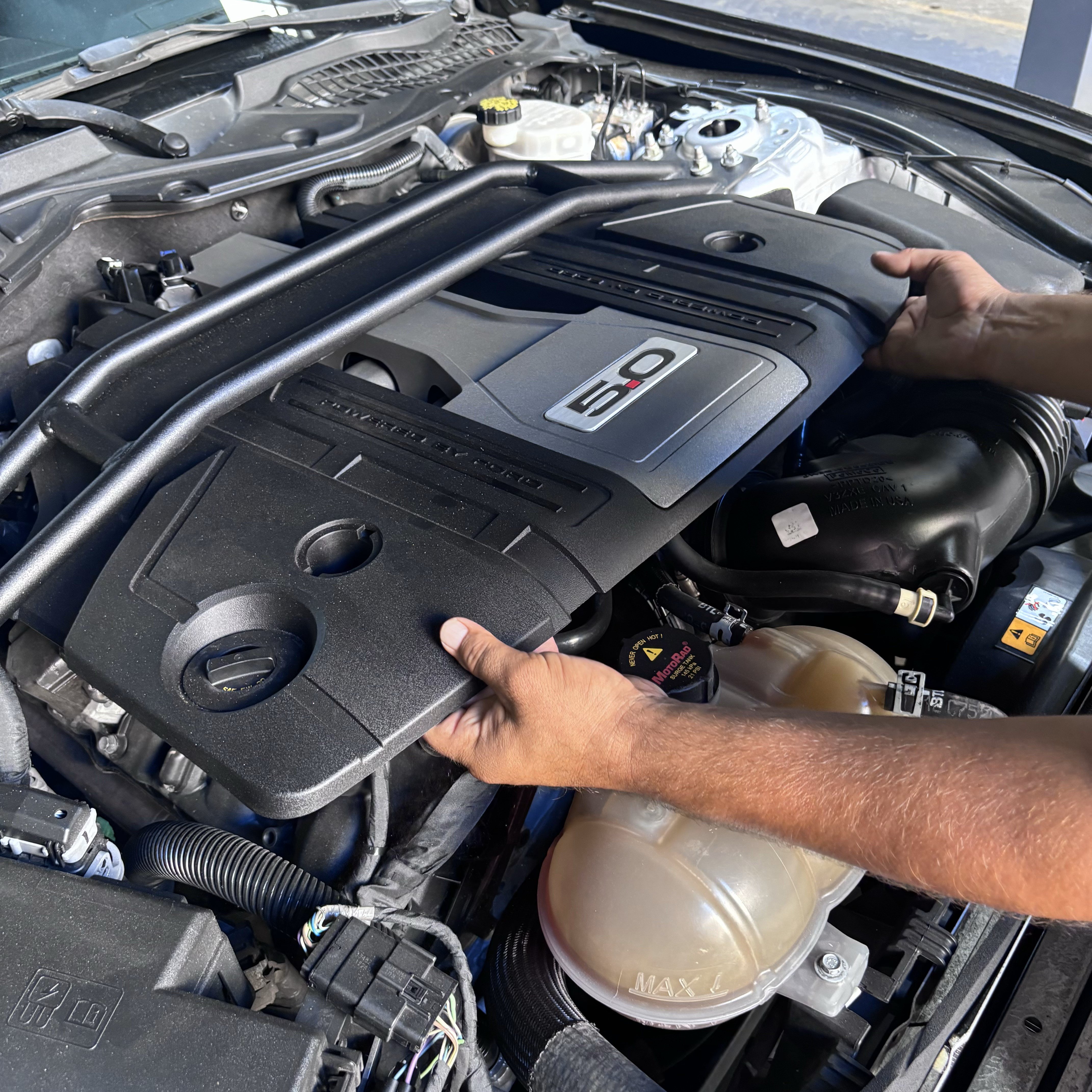 Remove engine cover by prying out the 2 covers with a flat screwdriver, removing the 10mm nuts and pulling up on the cover in the front and back.