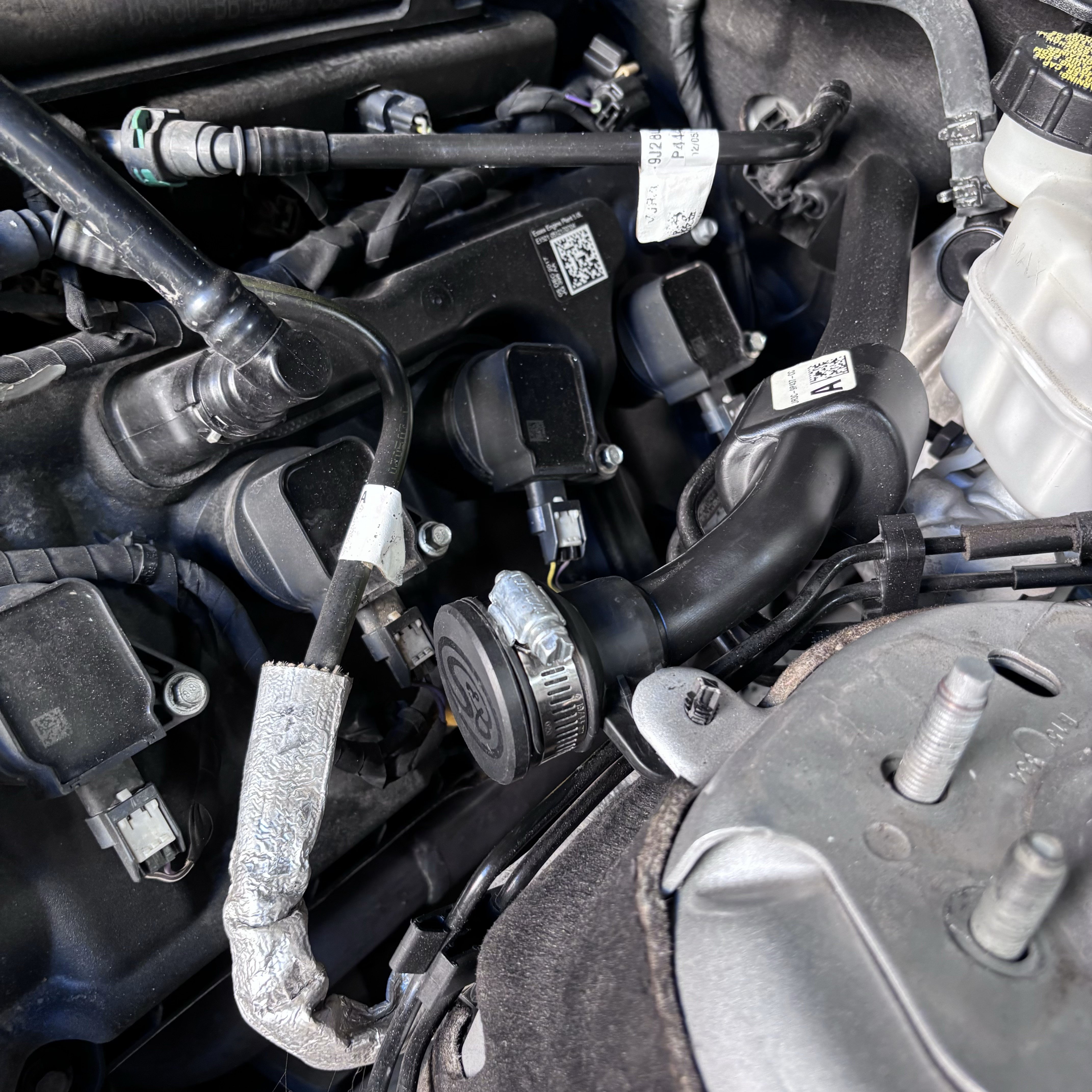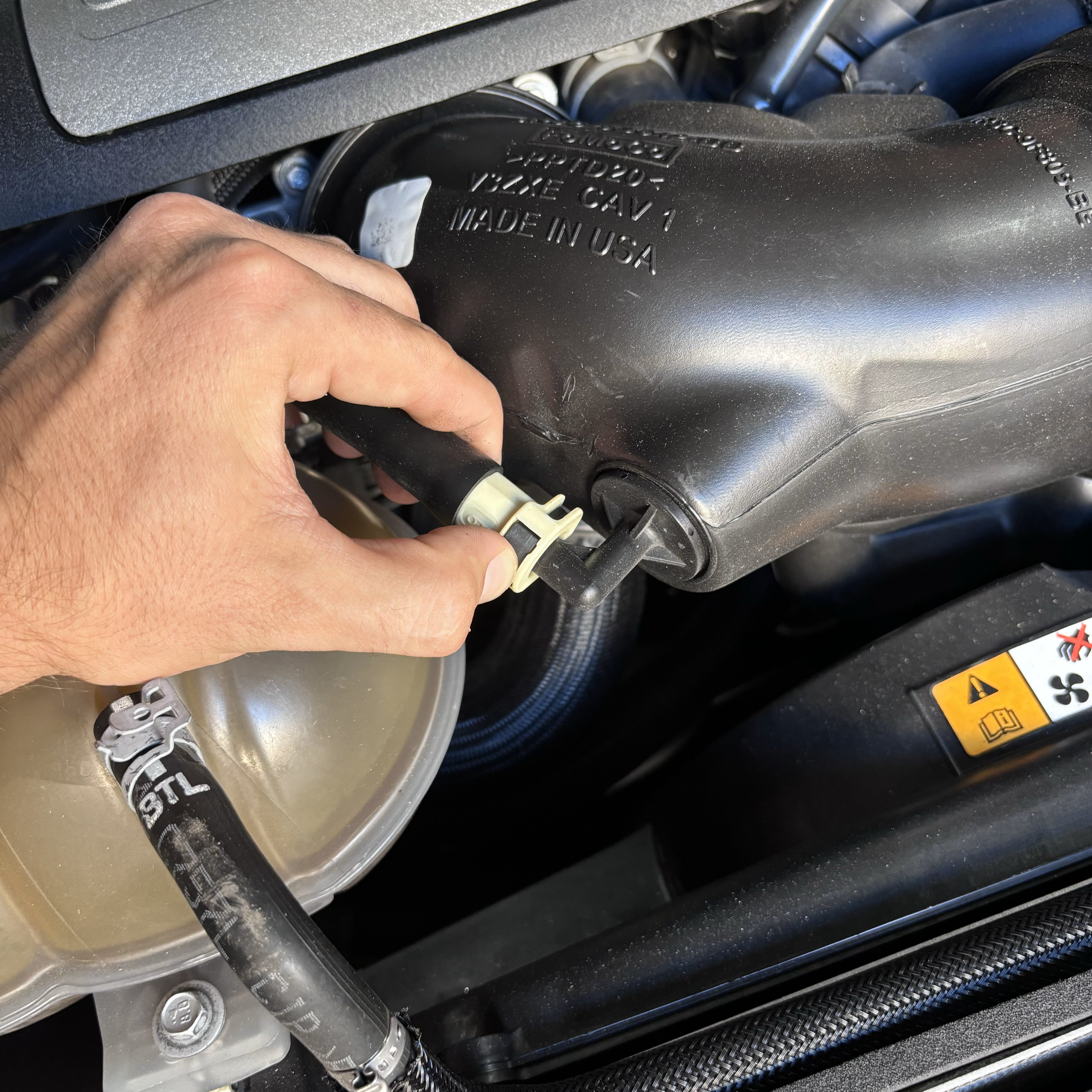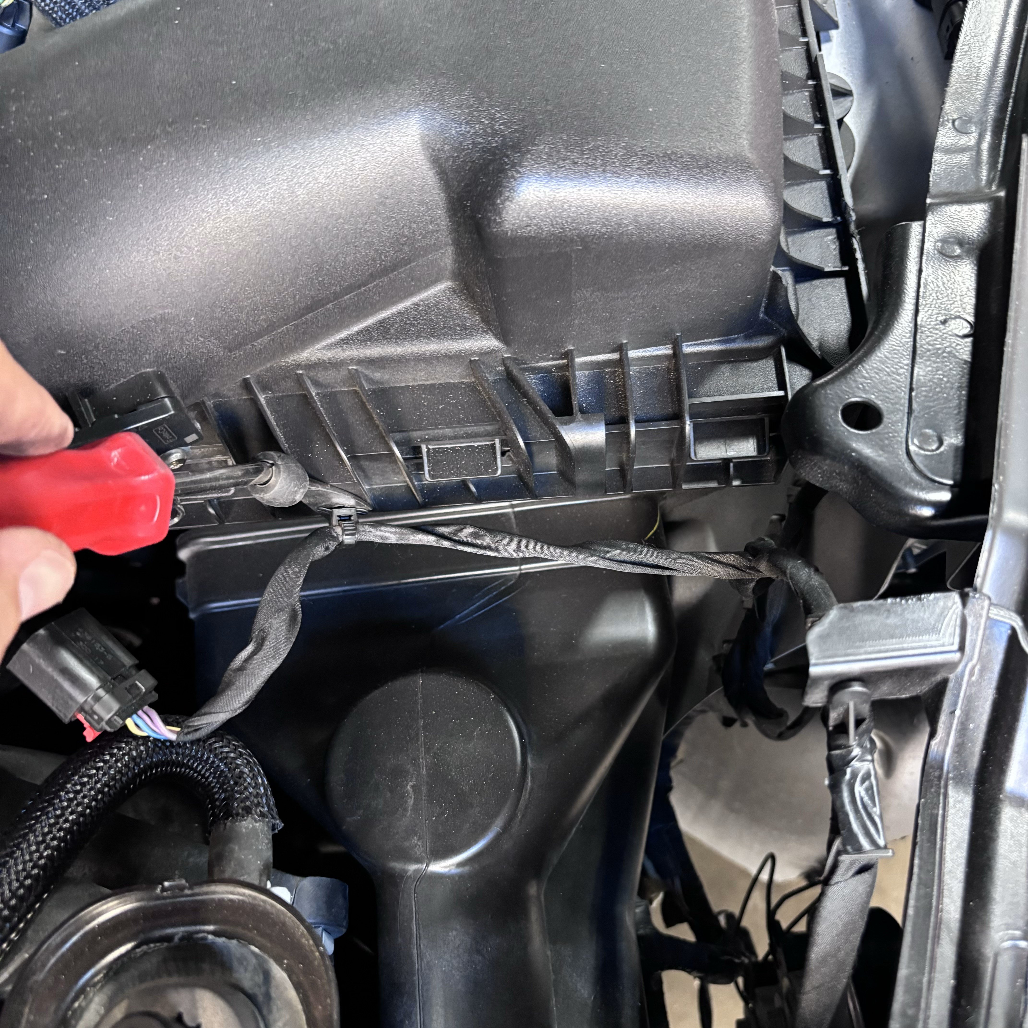 Slide the JLT scoop forward until it installs onto the OEM inlet and the airbox lip is between the 2 dots.