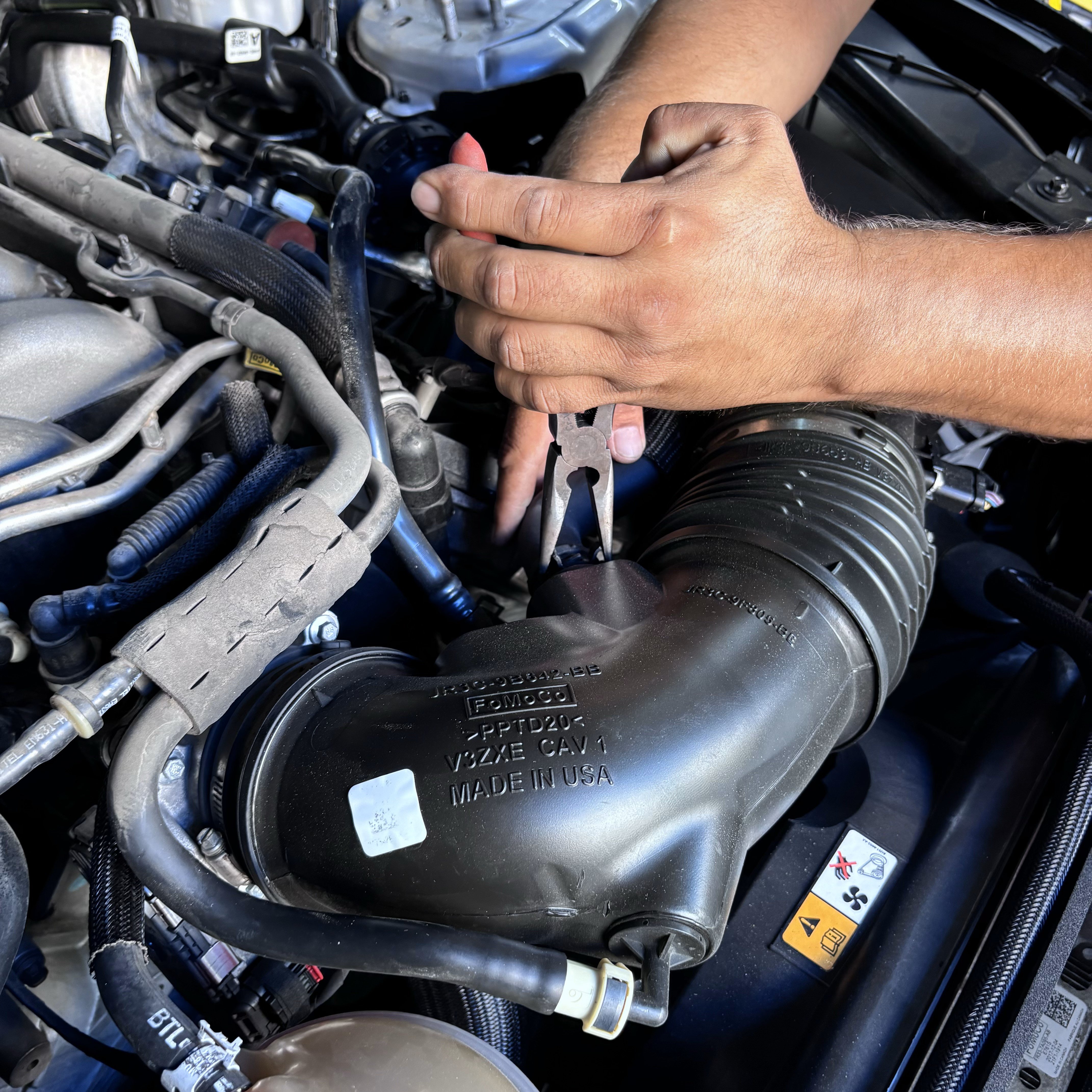 Install the filter onto the intake tube. Slide the tube into the coupler and then drop into the airbox.