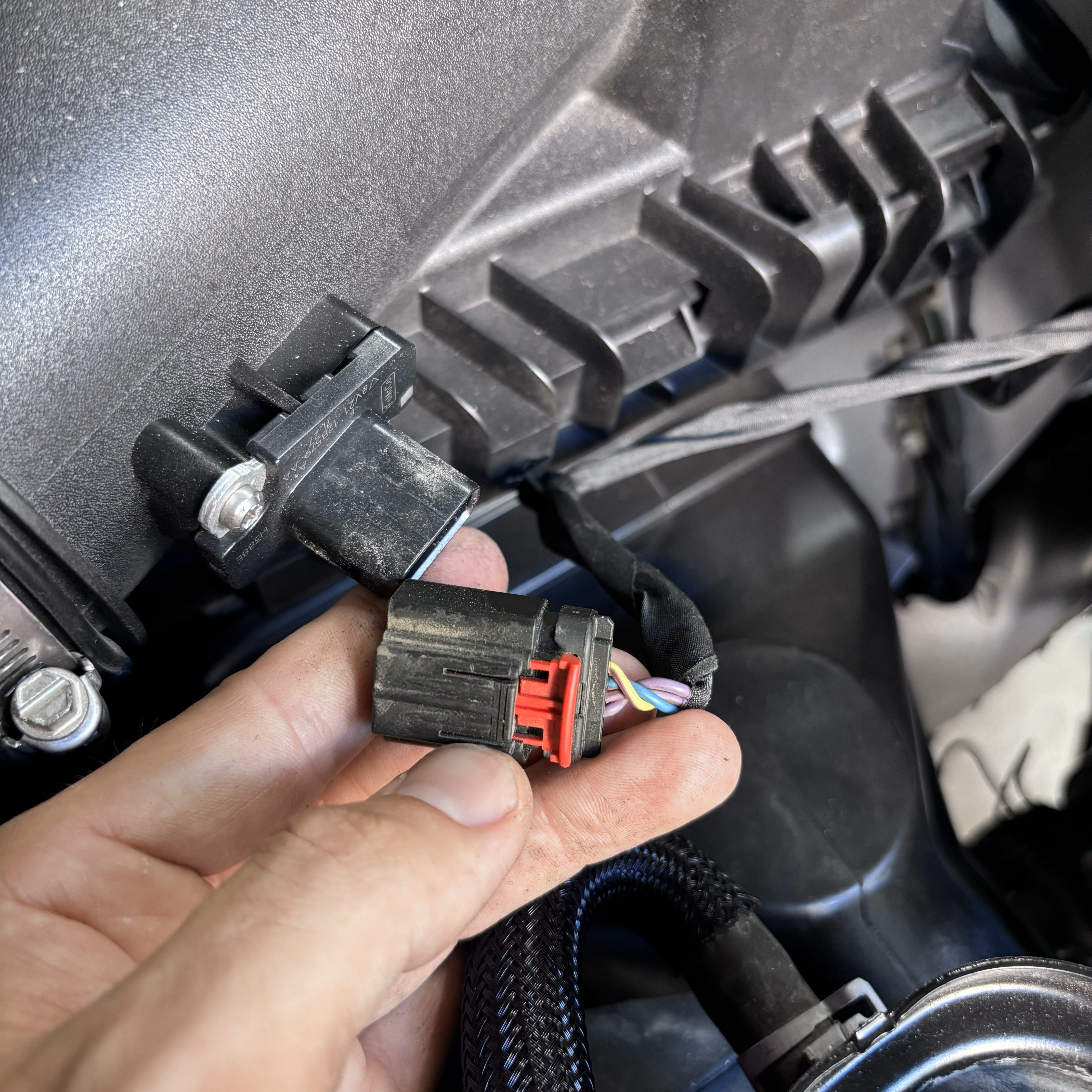 Remove the MAF sensor from the tube by sliding the red locking tab back and depressing the black button on the connector.