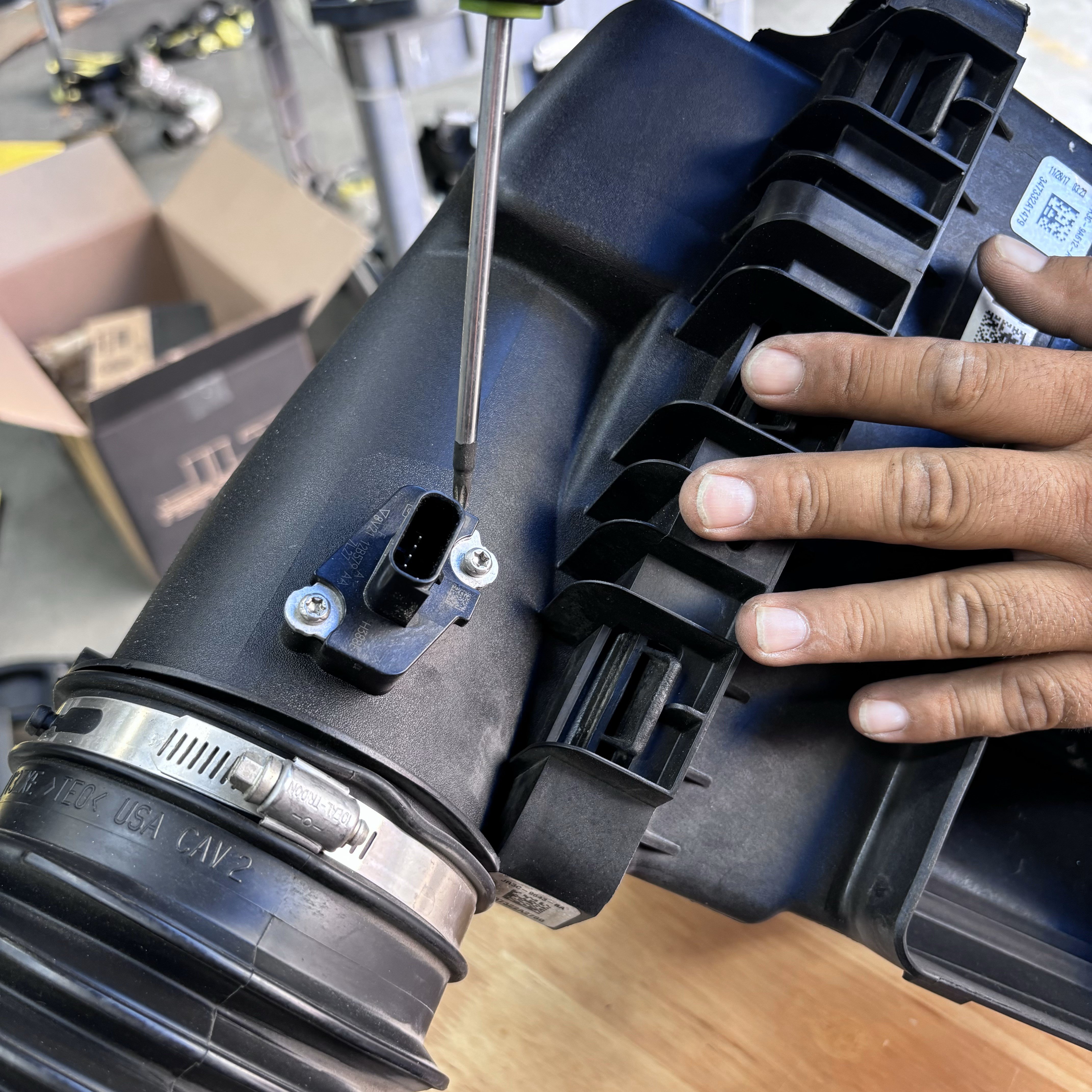Install the OEM MAF onto the JLT Intake tube. Install the gasket first and secure down with the included Phillips head bolts.