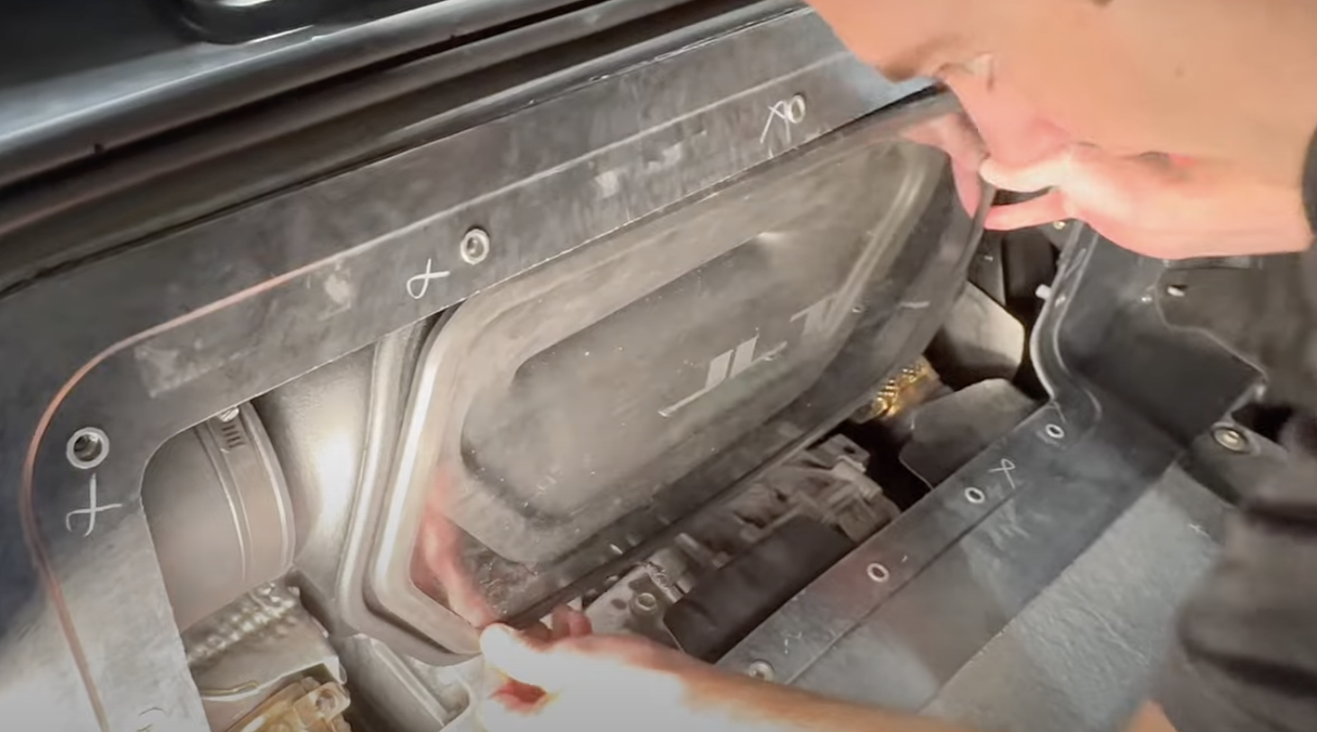 Install the JLT scoops and secure down with the bolts. They will be labeled left and right.
