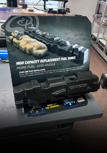 The S&B High Capacity Replacement Fuel Tank POP features a mini replica of an actual S&B replacement fuel tank.
