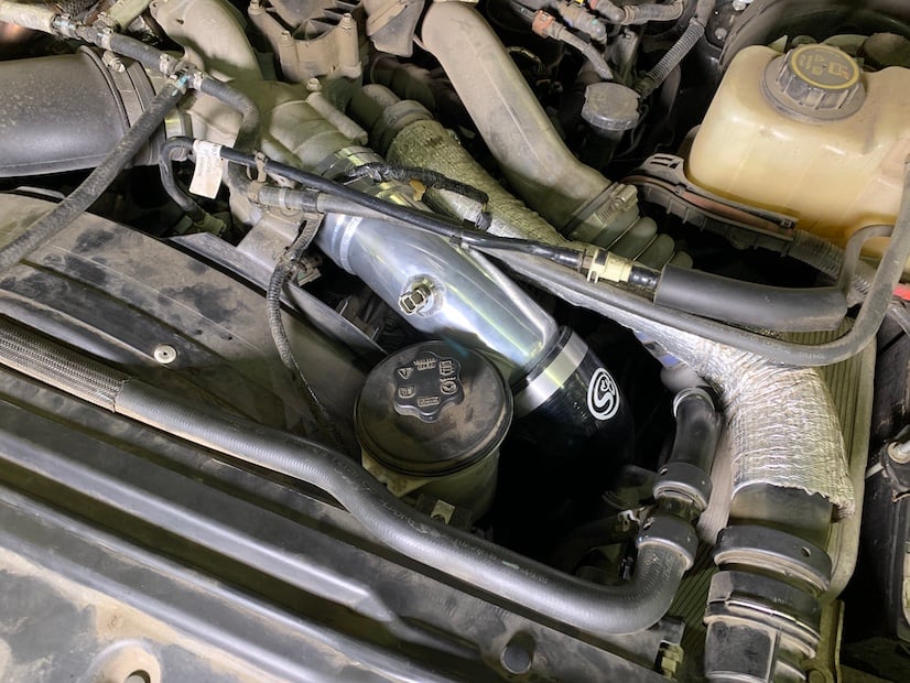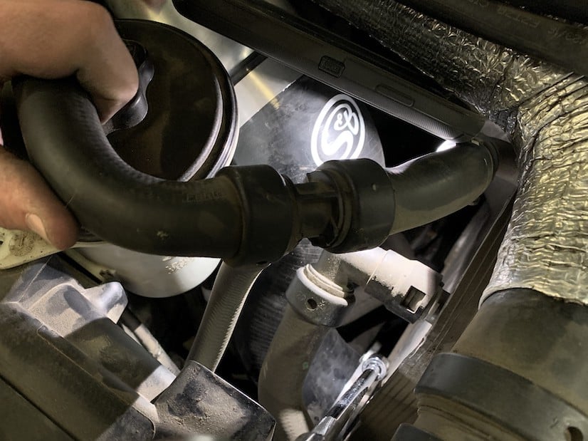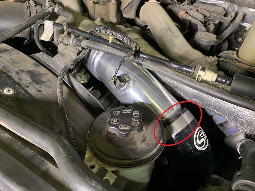 Lift the power steering reservoir from the support slot and carefully leave it off to the side while keeping it upright. This will give you more room when you install the CAC Silicone Hose (C).
