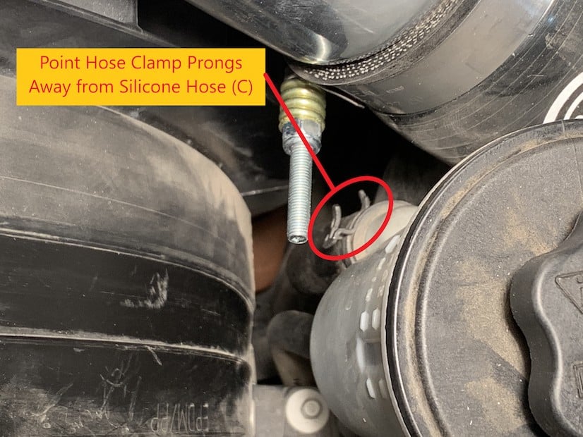 The upper T-Bolt Hose Clamp (D), should be positioned so that the spring and nut are underneath the CAC Silicone Hose, and pointed towards the front of the vehicle as shown below.