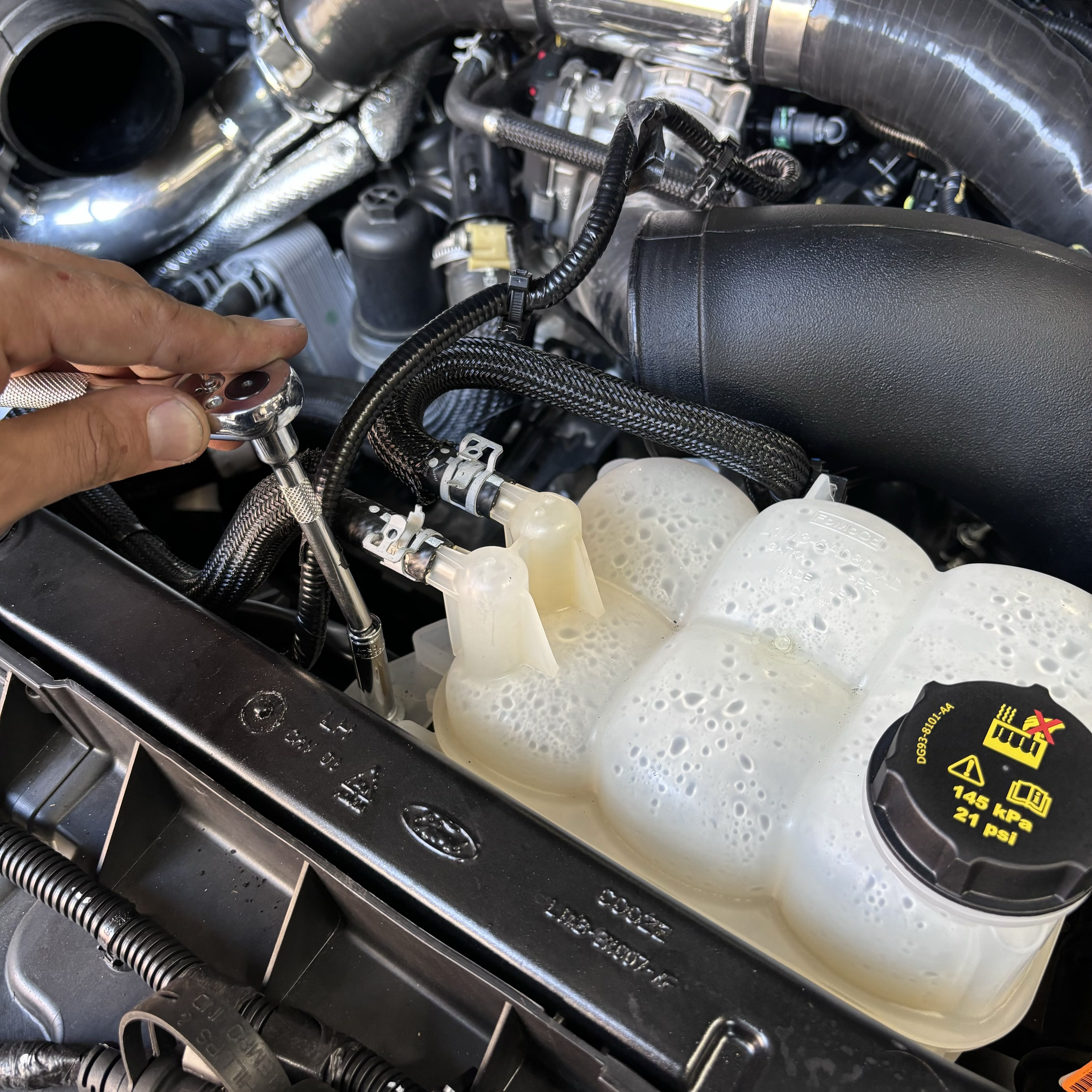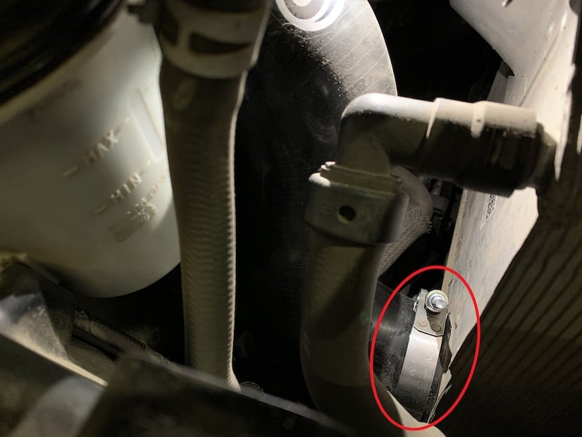 Remove the bolt under the coolant expansion tank with a 10mm socket