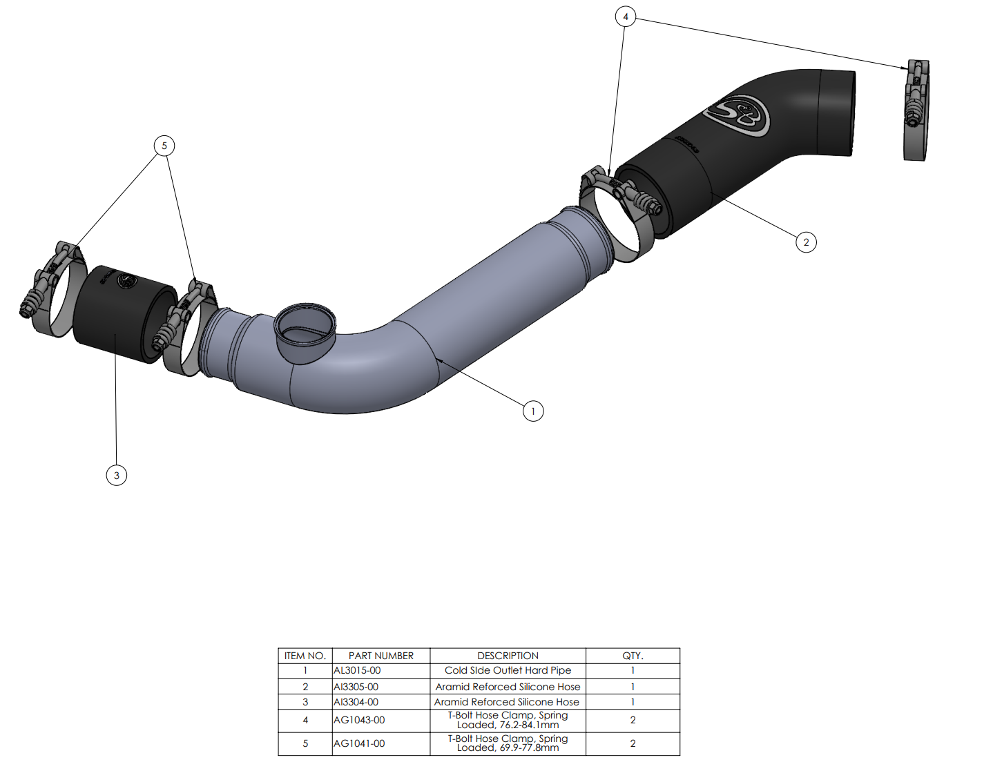 Make sure that the T-Bolt Hose Clamp (D) is positioned so that the T-Bolt, spring, and nut are away from touching anything. Tighten and torque the T-Bolt Hose Clamp to 75 in-lb.