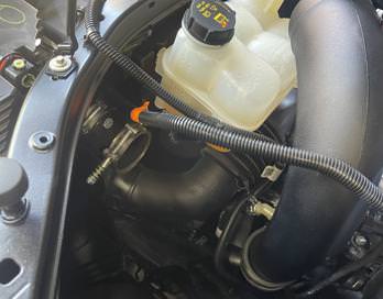 Secure the loose Temp Sensor harness with Cable Ties (F) to the plastic vacuum line as shown below. Cut off the excess cable tie with a Wire Cutter. Make sure to keep the plastic vacuum line and rubber coolant lines separated as it was from the factory to prevent them from rubbing on each other.