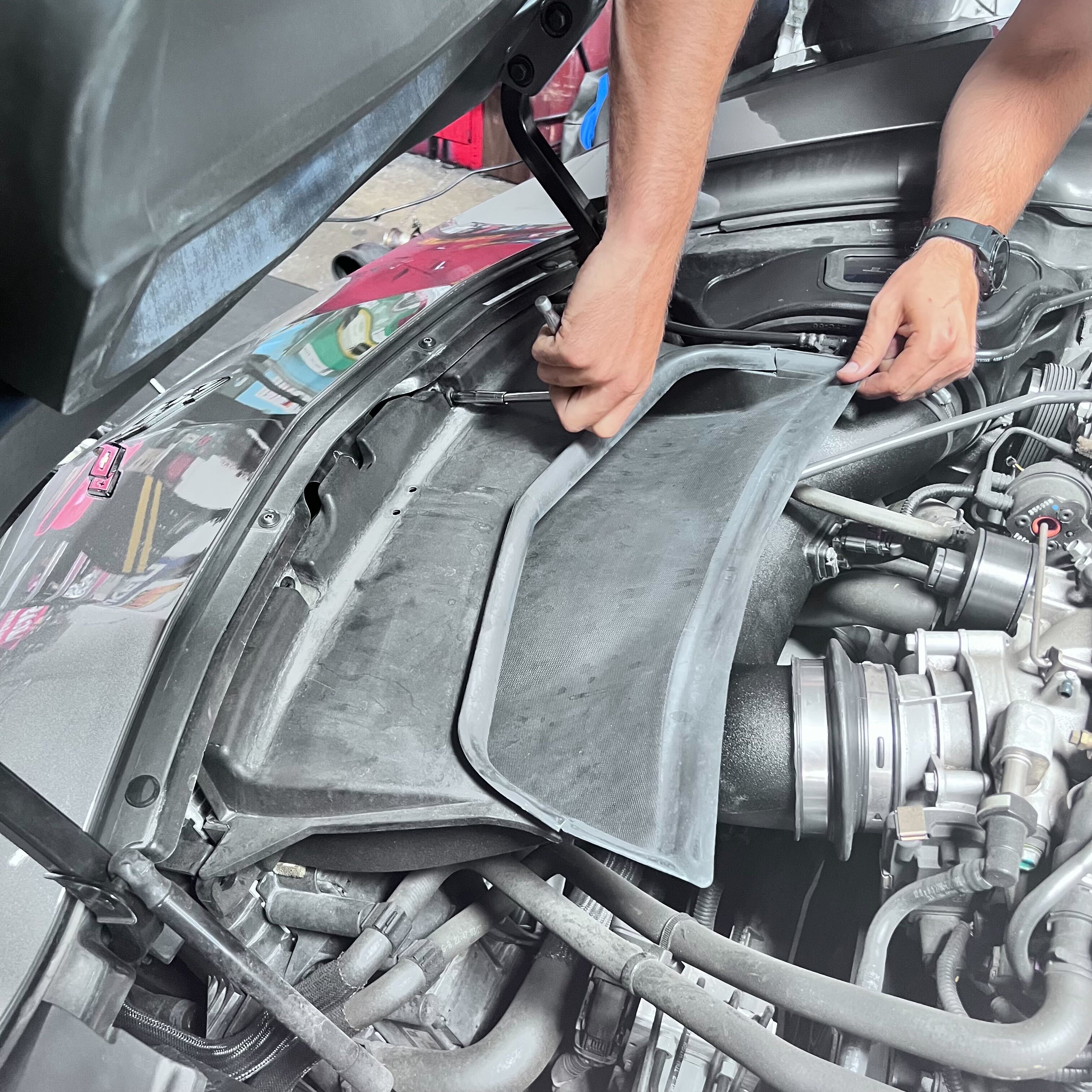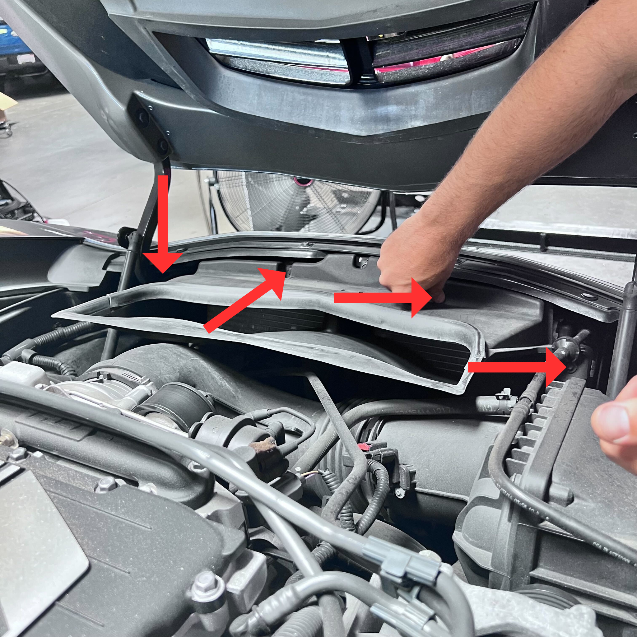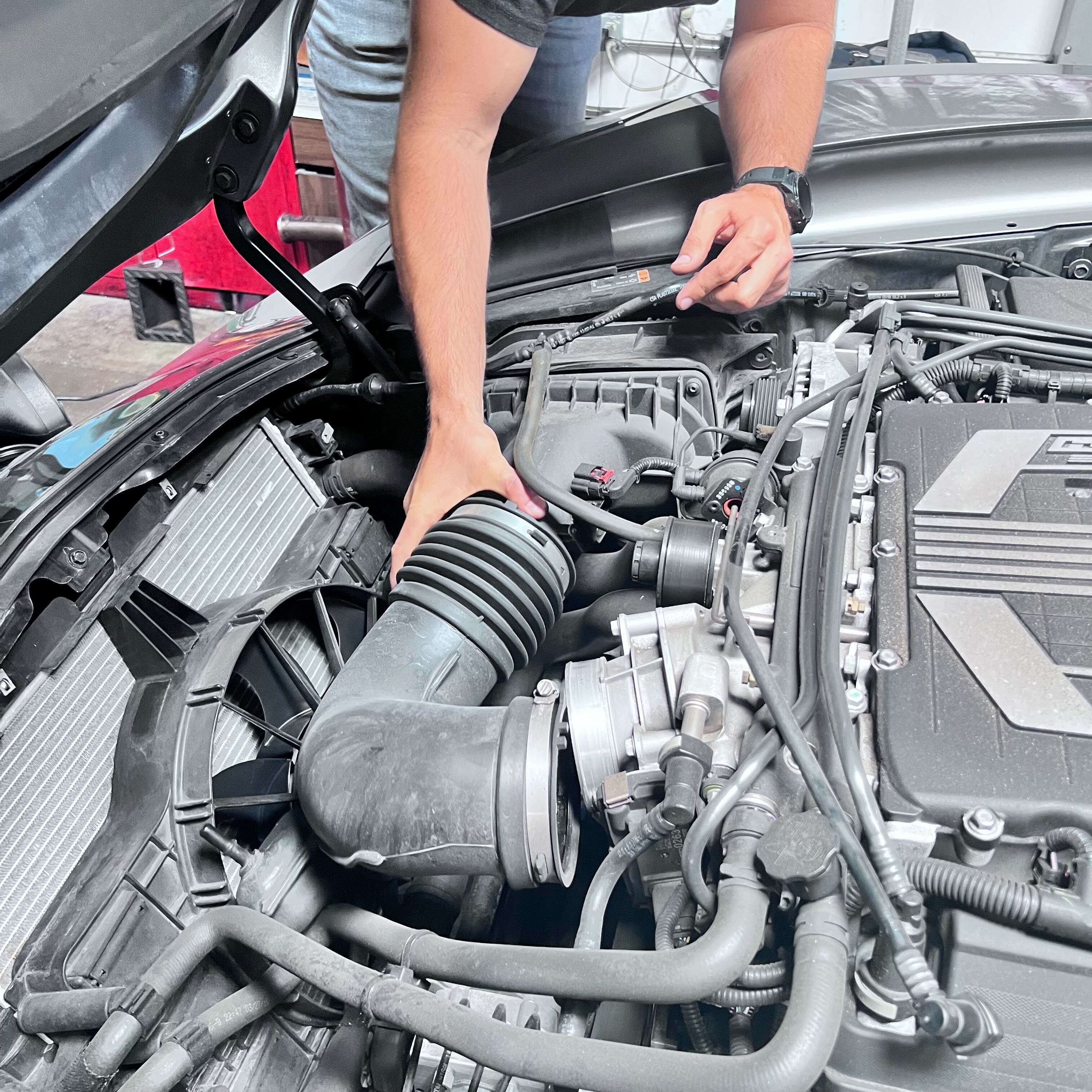 Begin the stock air intake removal by disconnecting the intake tube from the throttle body side. Once done, pull the entire intake assembly to the driver side of the engine bay as to not accidentally disconnect any hoses that hang over the air box.