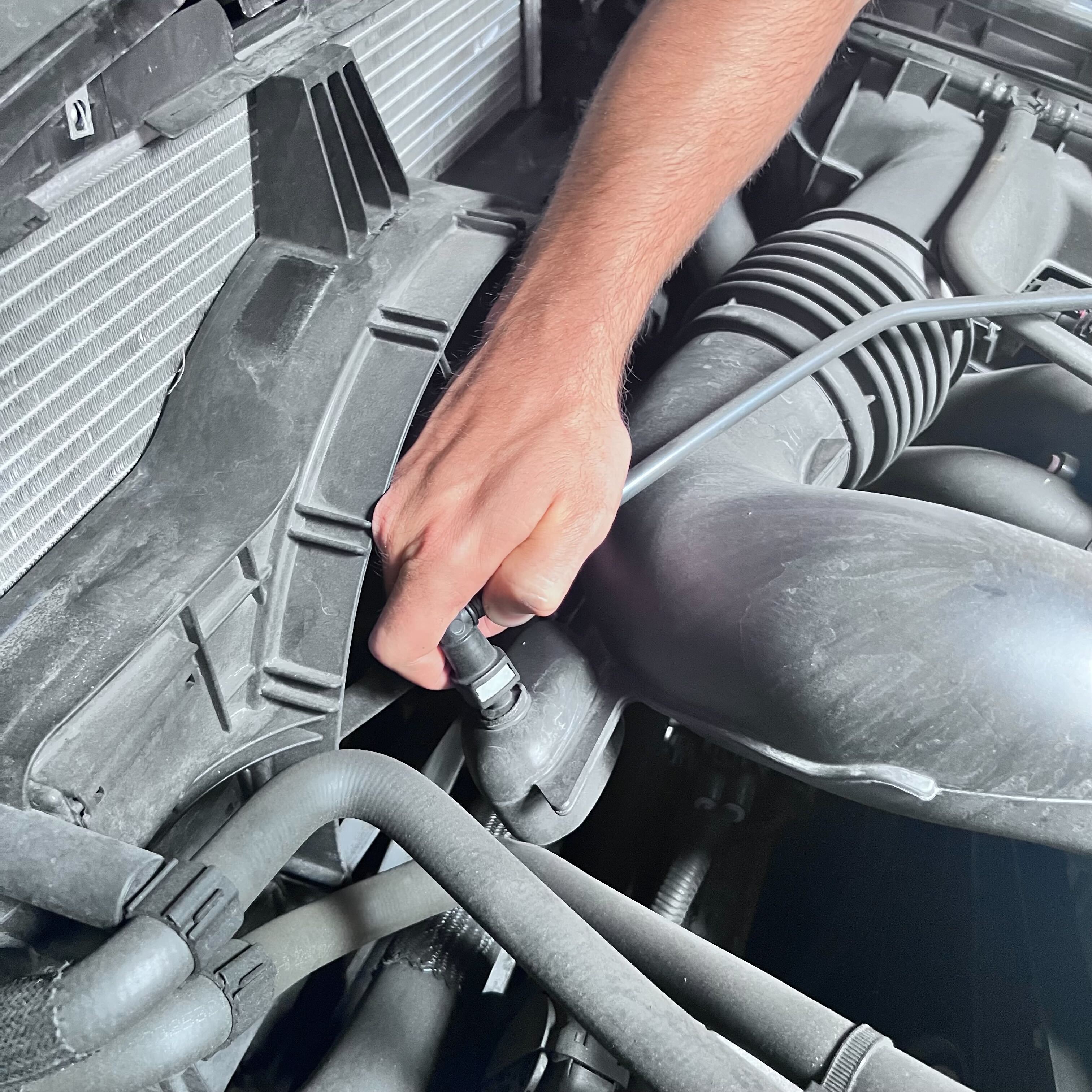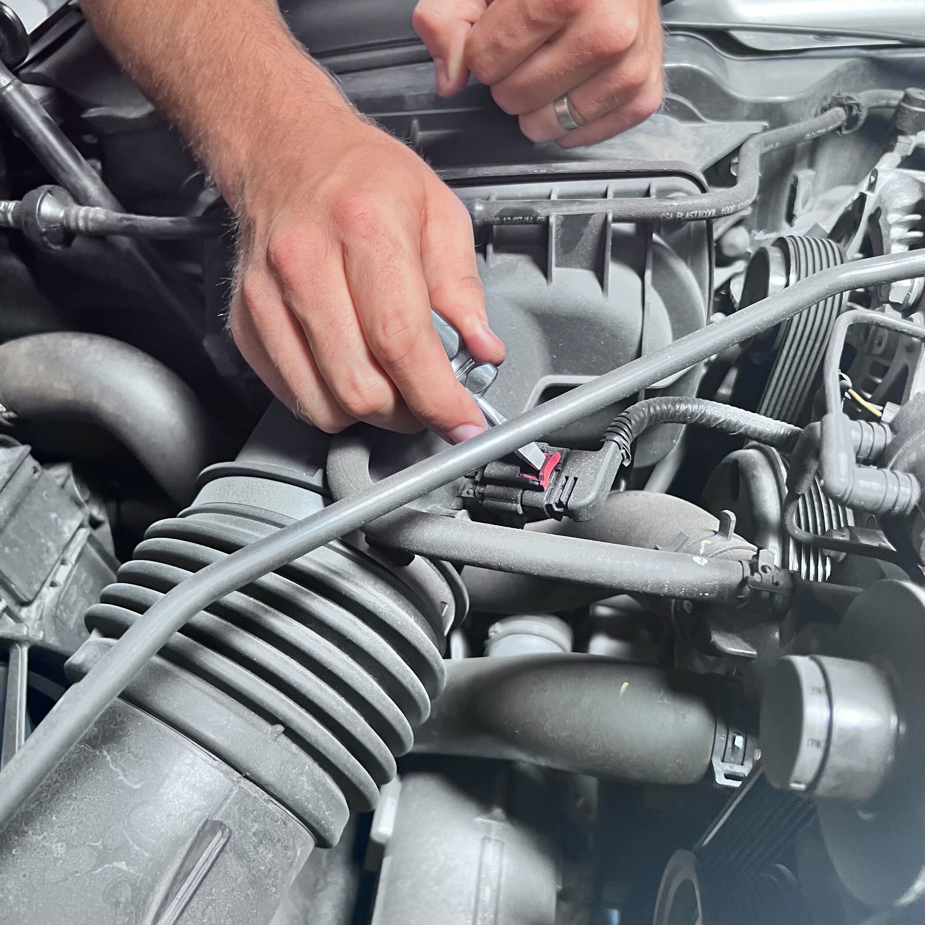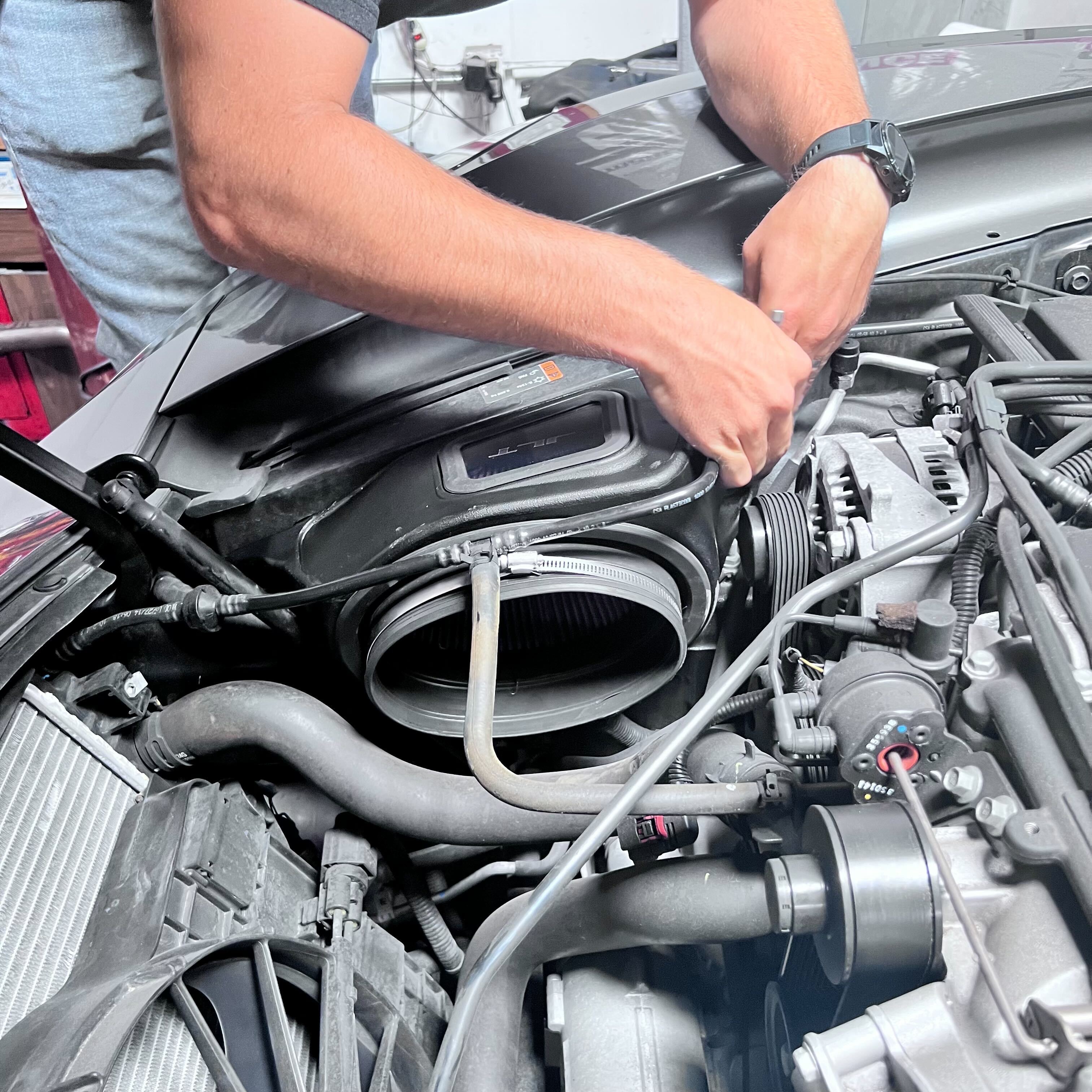 Once the intake kit is fully installed and all connection points are verified to be fully tightened, please reinstall the vent tube assembly.