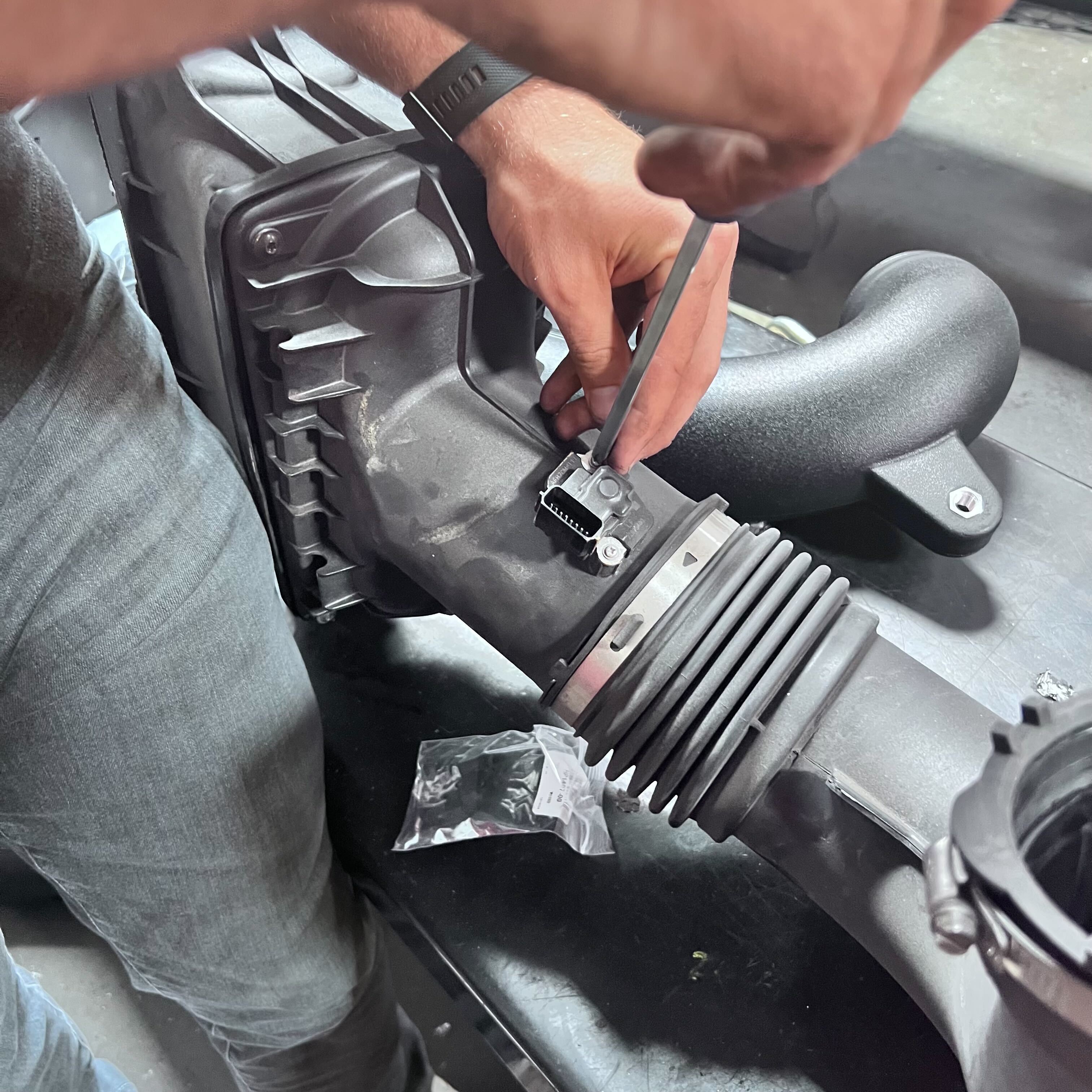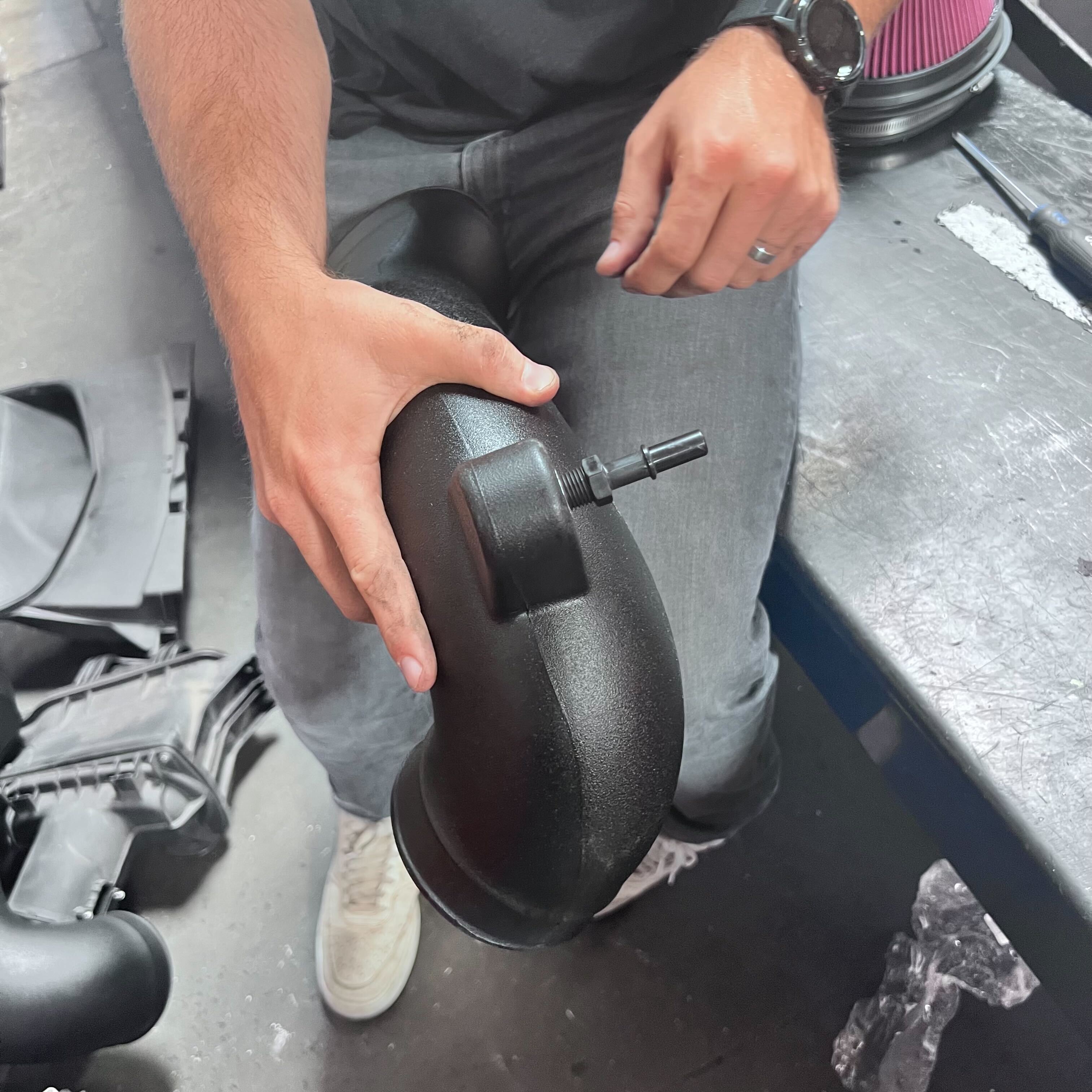 Next, clip in the quick connect sensor to the fitting located on the elbow of the intake tube.