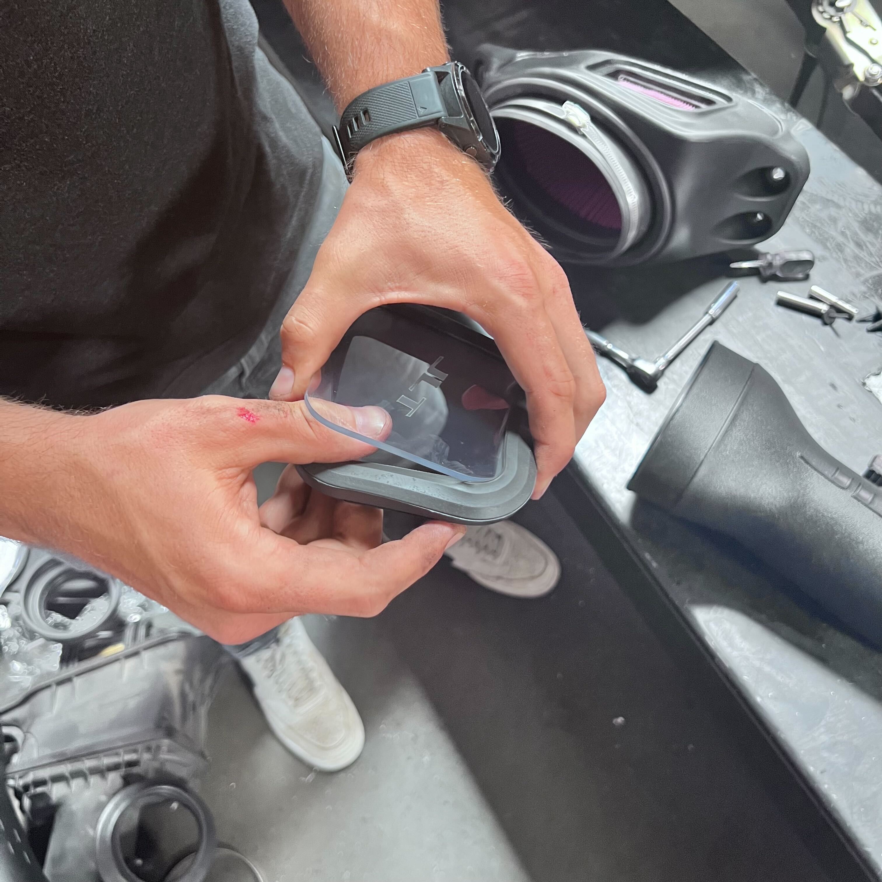 Take your new air filter and place it inside your new air box. Make sure you press fit the filter into the box, ensuring the molding is mounted flush with the opening.