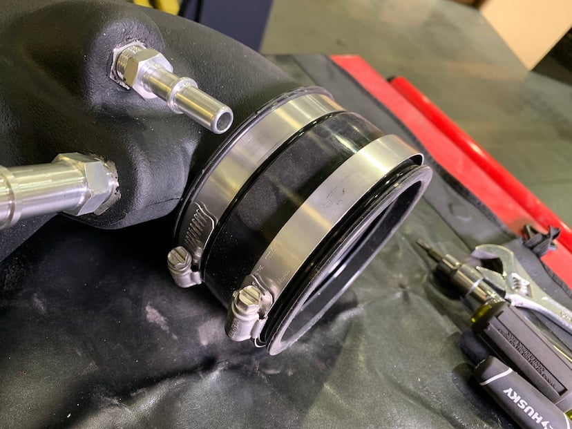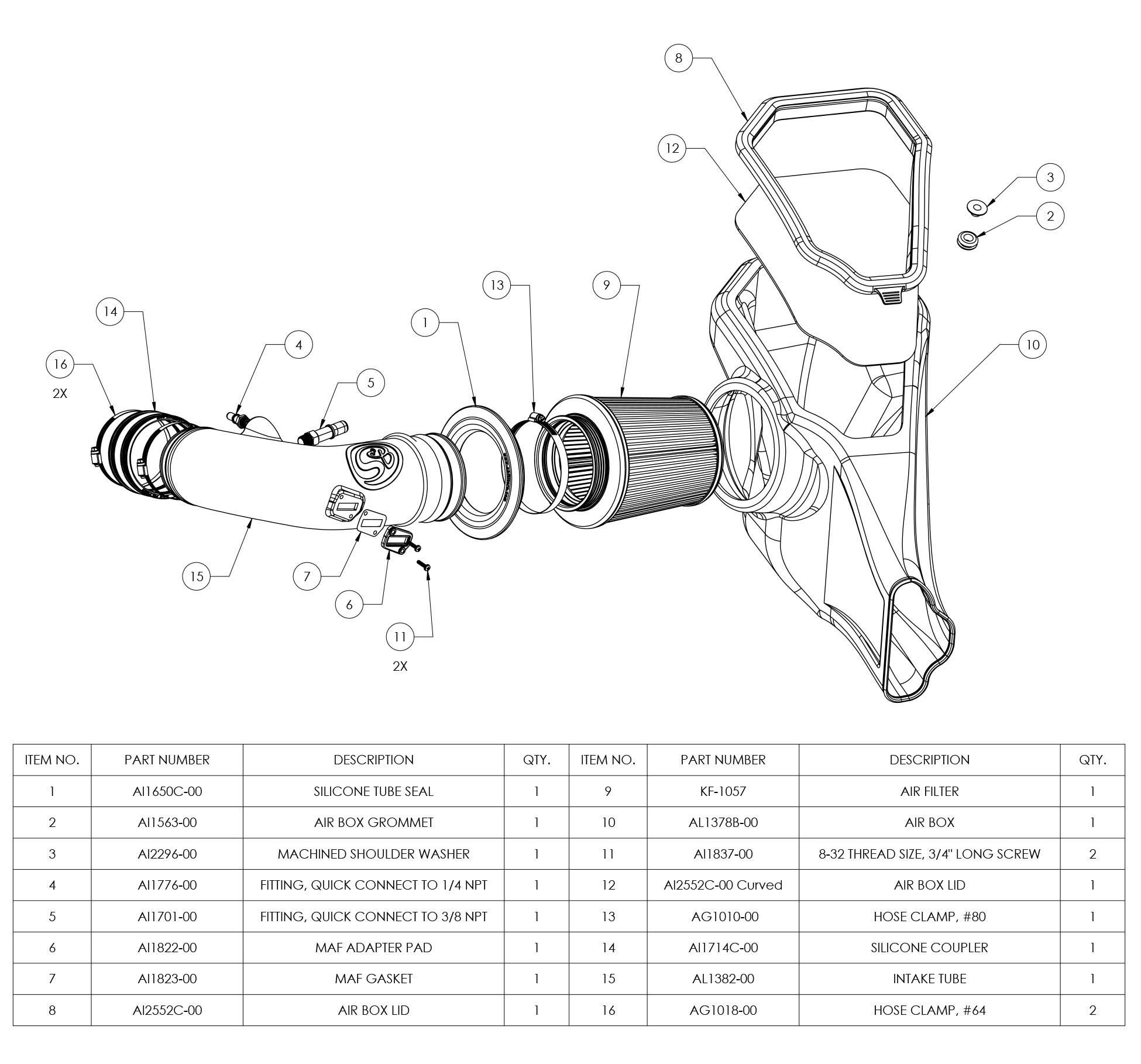 Prepare the S&B intake tube for installation by connecting all of the components shown in the picture to the intake tube. These components include the ¼ NPT quick connect (5), ⅜ NPT quick connect (4), silicone coupler, MAF sensor, MAF sensor pad (6) and MAF sensor gasket (7). Secure the silicone coupler (8) to the tube using a #64 hose clamp (14) and tighten the other #64 hose clamp around the other end of the coupler so that the hose clamp remains somewhat loose but doesn’t fall off.
