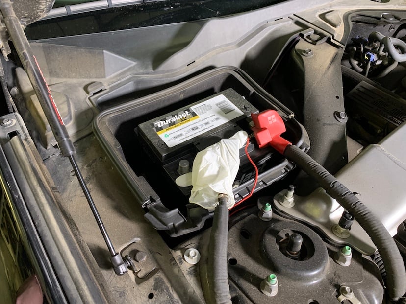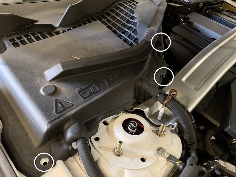 Remove the battery cover from the vehicle by removing the twist on panel screws in the 3 locations shown. To remove each screw, rotate the heads counter clockwise for a few rotations and then lift up.