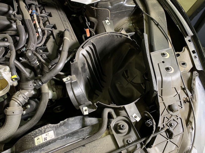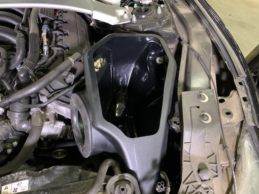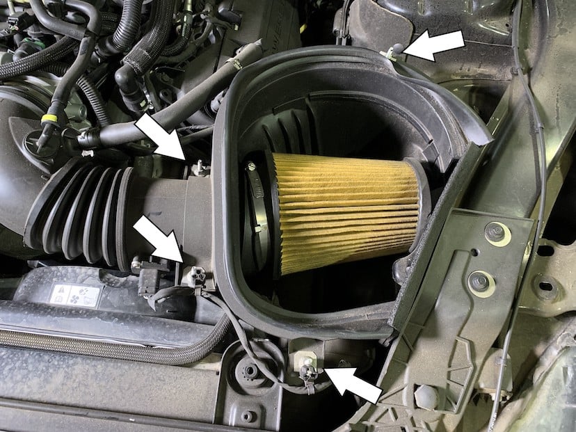 Remove the 4 threaded stud bolts from the stock intake box. Then remove the top half of the intake box from the vehicle.