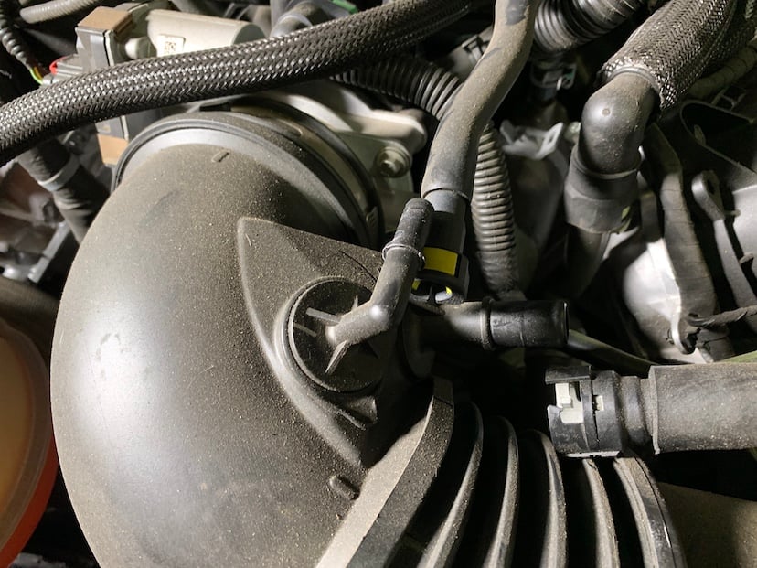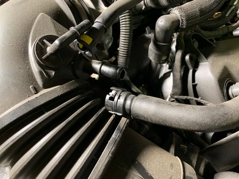 Disconnect the vacuum hose from the stock intake tube by pushing the yellow tab in and pulling out.