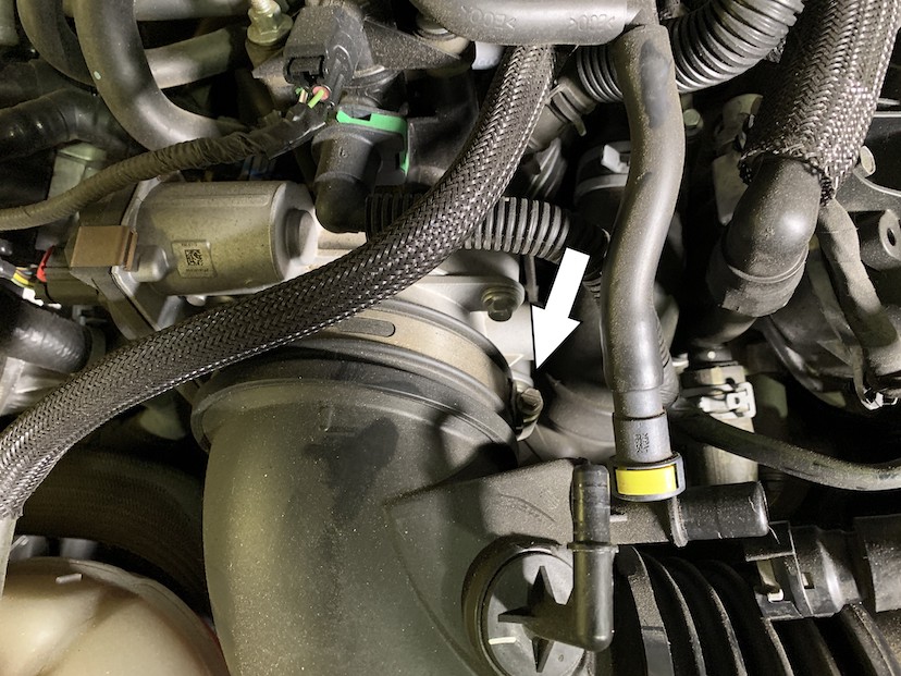 Disconnect the PCV hose from the stock intake tube by pushing the grey tab clockwise and pulling out.