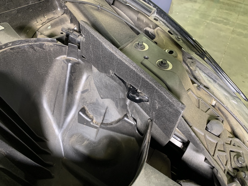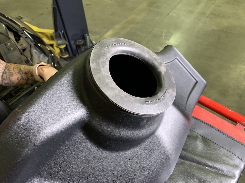 Remove the bottom half of the stock intake box and foam trim from the vehicle by lifting the intake box up and out. Be careful to not force the foam trim past the frame tab or it will rip.