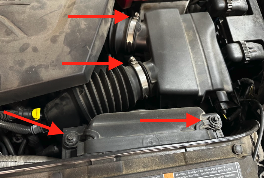 Start by loosening the hose clamps and removing the 2 bolts shown in the picture.