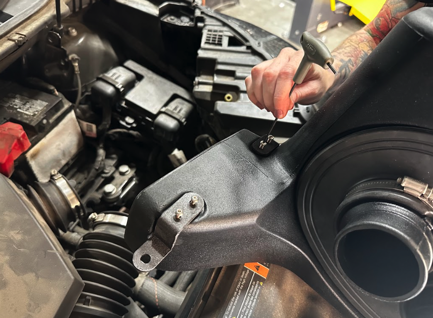 Using the provided hardware, install the two brackets onto the S&B air box.